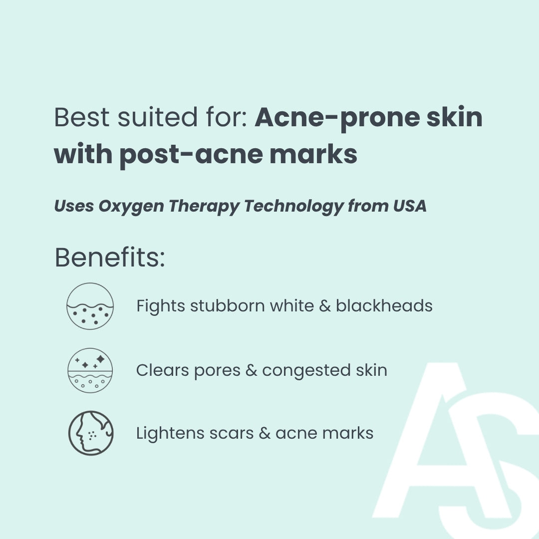 To accelerate the skin’s recovery post-acne treatment, lighten acne marks and reinforce its natural barrier, a blend of amino acids and calming complexes is delivered to the skin with advanced oxygen therapy technology.